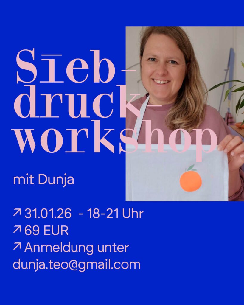Kreative Auszeit mit Siebdruck für dich: am 25.10. kommt wieder Duni zu uns und führt dich in die Grundtechnik des Siebdrucksein. Du bekommst zwei Druckträger, hast eine tolle Farbauswahl und natürlich ganz viel Inspiration.